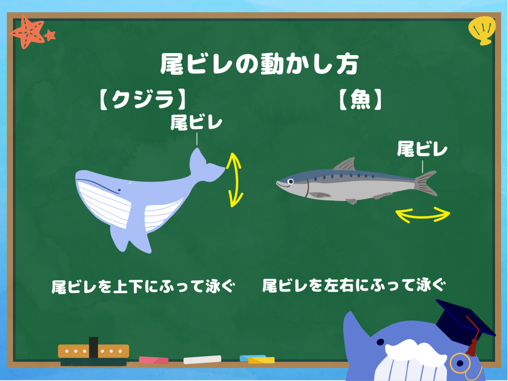 一方、クジラは尾ビレを「上下(たて)」にふって泳ぎます。