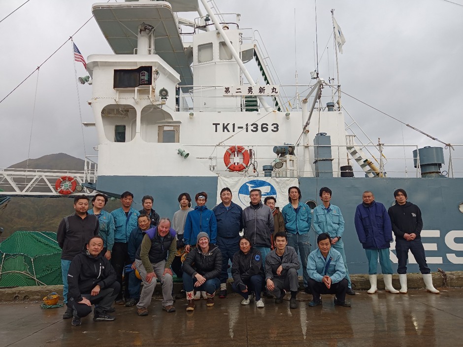 2024年度に調査団長として参加した国際捕鯨委員会/日本共同北太平洋鯨類目視調査(POWER)の際にダッチハーバー(アメリカ)で撮影した調査員と乗組員の集合写真(本人は前列左端、写真提供:日本鯨類研究所・国際捕鯨委員会)