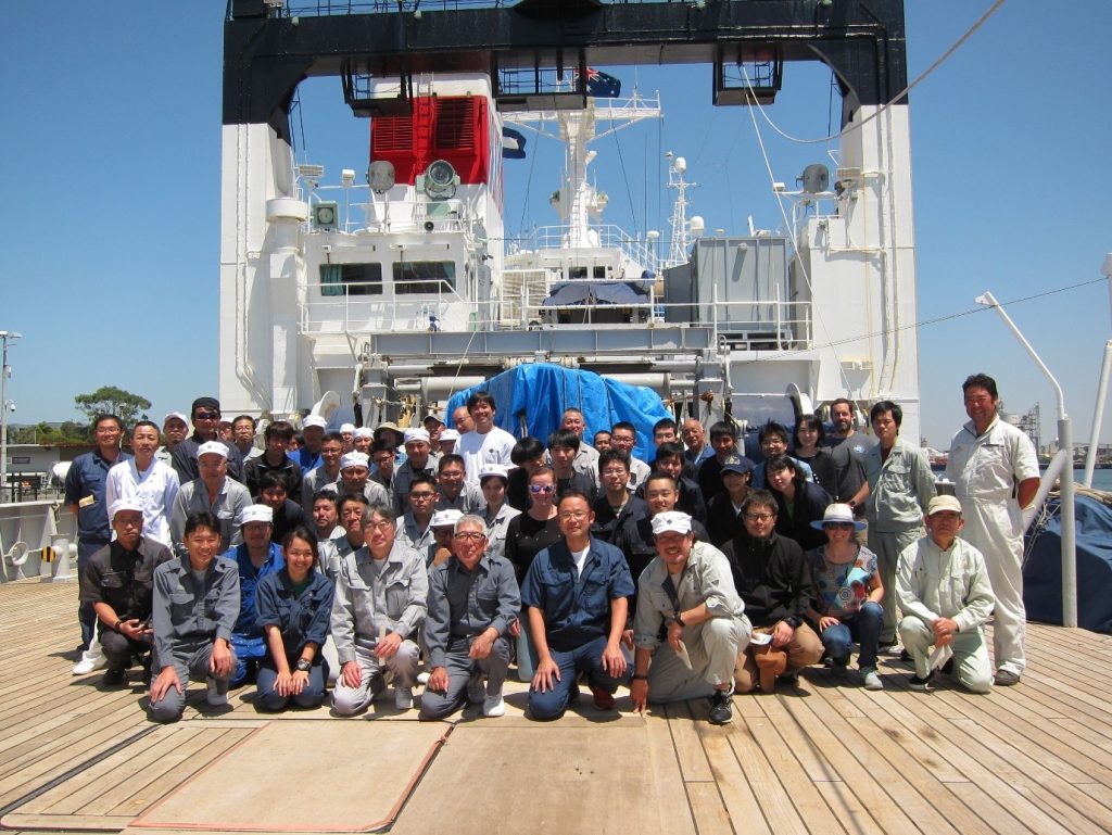 2018年度に主席調査員として参加した水産庁開洋丸による「南極海東インド洋区におけるナンキョクオキアミを中心とした生態系総合調査」の際にメルボルン(オーストラリア)で撮影した調査員と乗組員の集合写真(本人は前列中央、写真提供:水産庁)