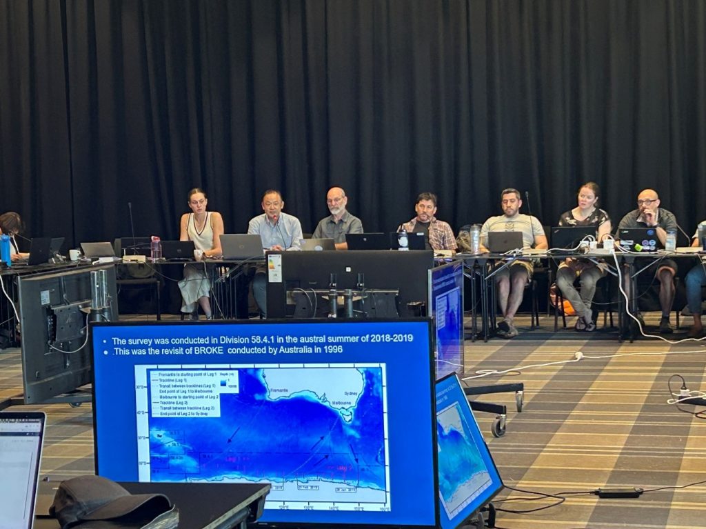 南極の海洋生物資源の保存に関する委員会生態系モニタリング管理作業部会(CCAMLR WG-EMM)での議論(本人は左から2番目)。クジラや海の生態系の管理は科学的知見に基づき、様々な人との議論を経て決められる。