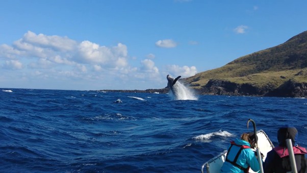 学生が参加して実施している、八丈島でのザトウクジラを対象とした目視調査(写真提供:八丈町・八丈島観光協会・東京海洋大学鯨類学研究室)