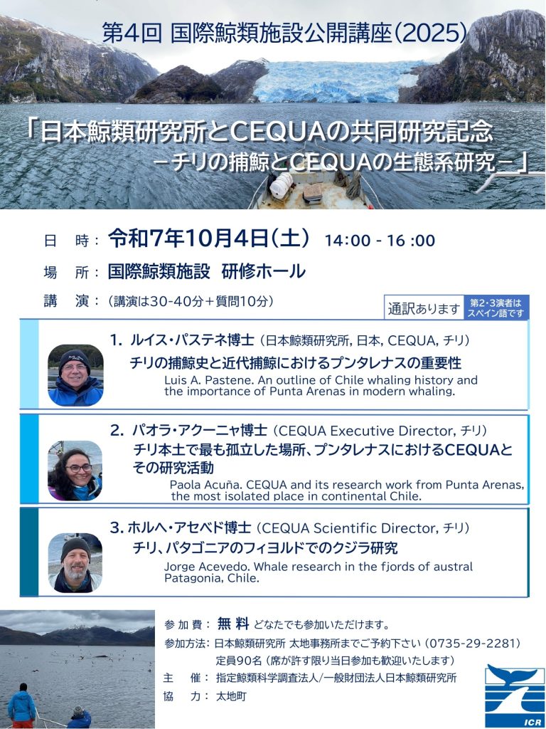 講座のテーマは「日本鯨類研究所とCEQUAの共同研究記念ーチリの捕鯨とCEQUAの生態系研究」です。