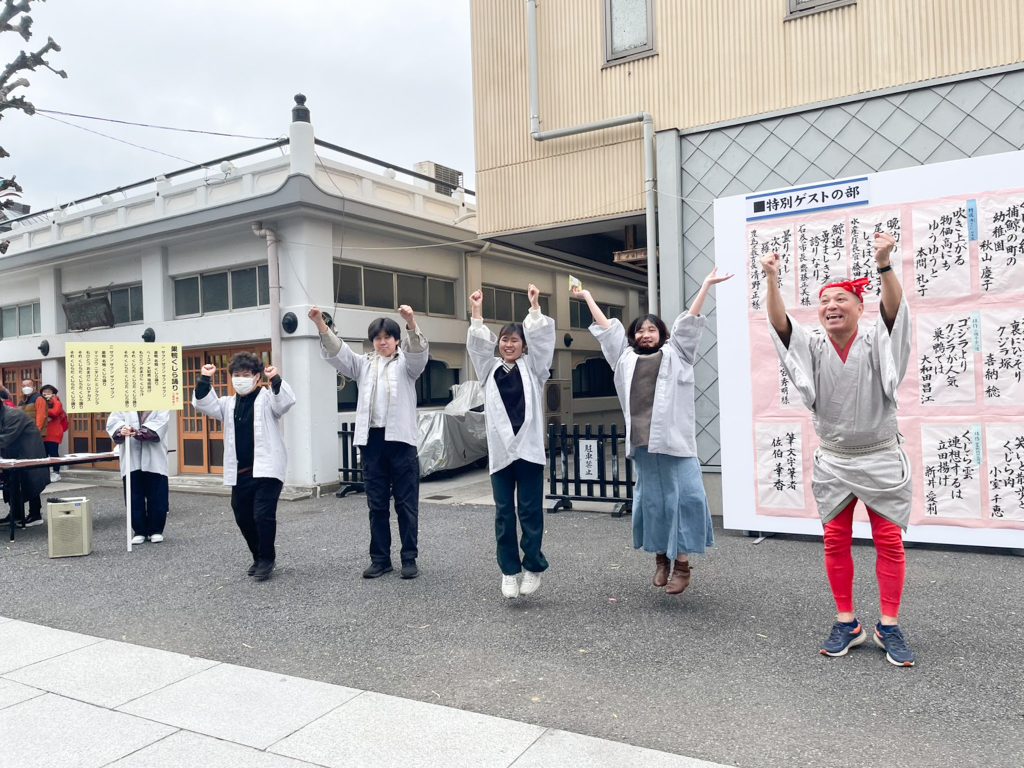 ちなみに、三遍稽古とは落語の世界ならではのしきたりで、師匠が弟子と向かい合って、教えたい噺を3回披露したら、弟子は4回目には同じことをひとりで実践できなくてはいけないというものです。金八師匠の期待に見事応えた泰誠君は、一緒にステージに上がった大正大学の学生とともに、観客からあたたかい拍手を送られました。