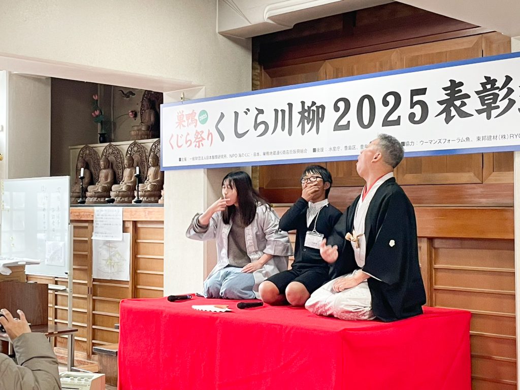 2人の弟子に稽古をつけた金八師匠は、続けて、自作のビンゴカードを参加者に配布して、「くじらビンゴ」を開始。これは、「①クジラの種類」「②クジラの部位」「③捕鯨基地・クジラと縁の深いまち」「④クジラモチーフのゆるキャラ・クジラが入った慣用句」「⑤クジラ料理」の5種類の言葉で構成されたビンゴで、「①イワシクジラ」「②鹿の子」「③網走」「④ガスクジラ・めくじら」「⑤タレ」などのキーワードが次々と読み上げられていきました。