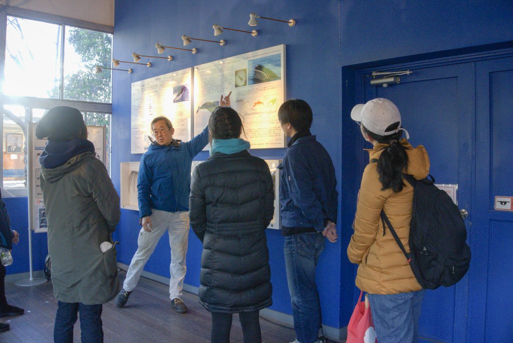 清掃作業に先立ち、まずは参加者に向けてマリンサイエンスミュージアムの館長である茂木正人さんによるミニレクチャーが行われました。今回お掃除の対象となる骨格標本がどの種類のクジラであるのか、そしてクジラの骨格にはどのような特徴があるのか等について、専門的に解説されました。
