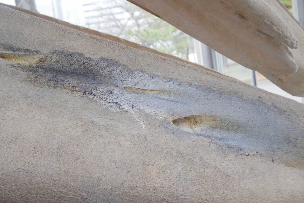 驚くべきことに、クジラの骨からは今もなお油が滲み出ており、床に油が垂れている箇所もありました。学芸員の方によれば、「気温の上がる夏場は油がでやすい」とのこと。参加者は「独特な匂いだ」と興味津々な様子。 「臭い」と感じる方もいるとのことですが、その匂いもまた本物だからこその産物ですね。