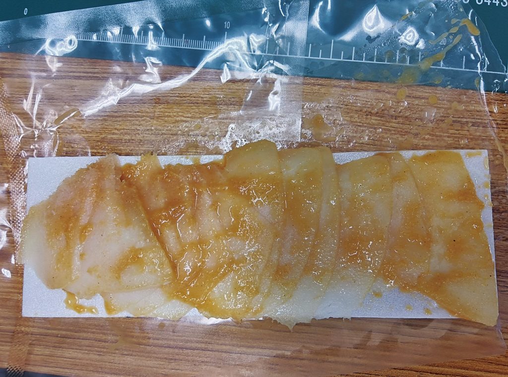 また、松田氏の授業のあとには、北海道オホーツク産のナガスクジラの赤肉と本皮の味噌漬を試食した。鯨肉は共同船舶(株)(所英樹社長)と(株)g―next(多田雅彦社長)が協力した。