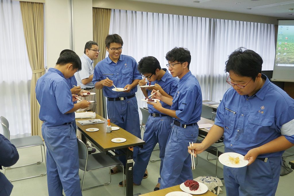 赤肉、本皮の味噌漬とも、一人各3切れ程度ずつ試食。阿久津園長をはじめ、教職員も生徒とともに鯨肉を試食し改めて鯨食文化を共有した。