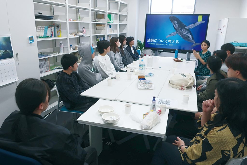 【枚方】摂南大学農学部(大阪・枚方市)食農ビジネス学科・副島久実准教授のゼミ学生有志を対象に11月12日、「捕鯨について考える」授業が行われた。捕鯨と鯨食文化を若い世代へ継承していくことを目的に、日本捕鯨協会で国際対策を担当する松田彩アドバイザーが、学生11人に写真や動画なども交えて分かりやすく捕鯨の現況などを話した。