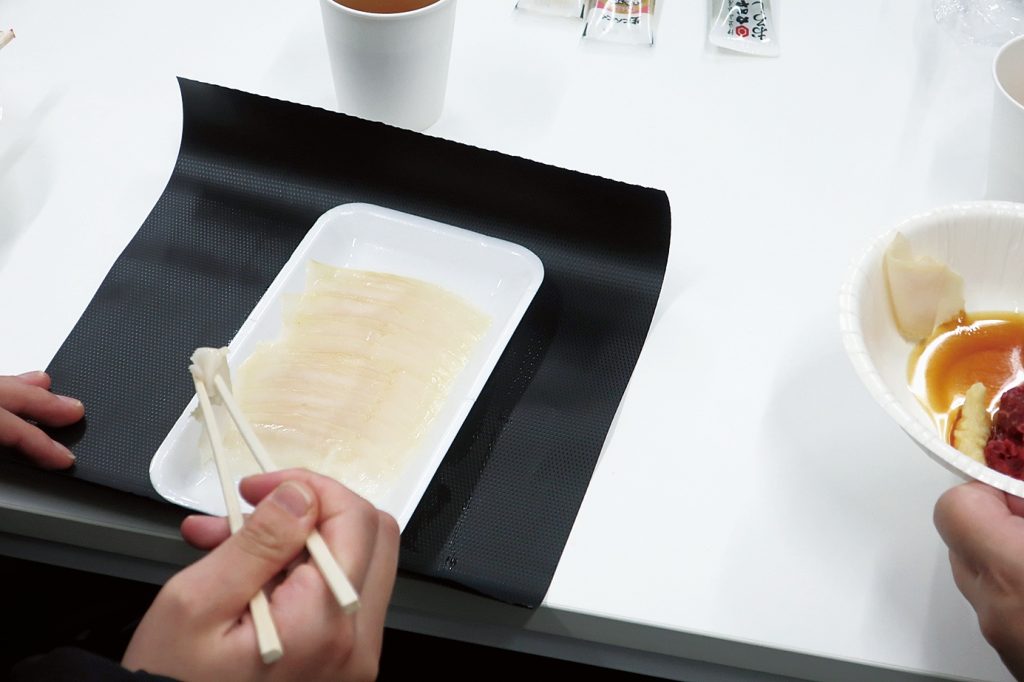 講義と並行して、学生は北海道オホーツク産のナガスクジラの赤肉とアイスランド産の本皮の味噌漬を試食し、その味を確かめた。